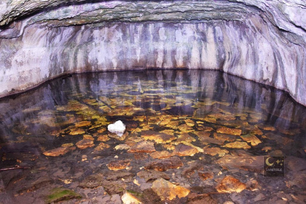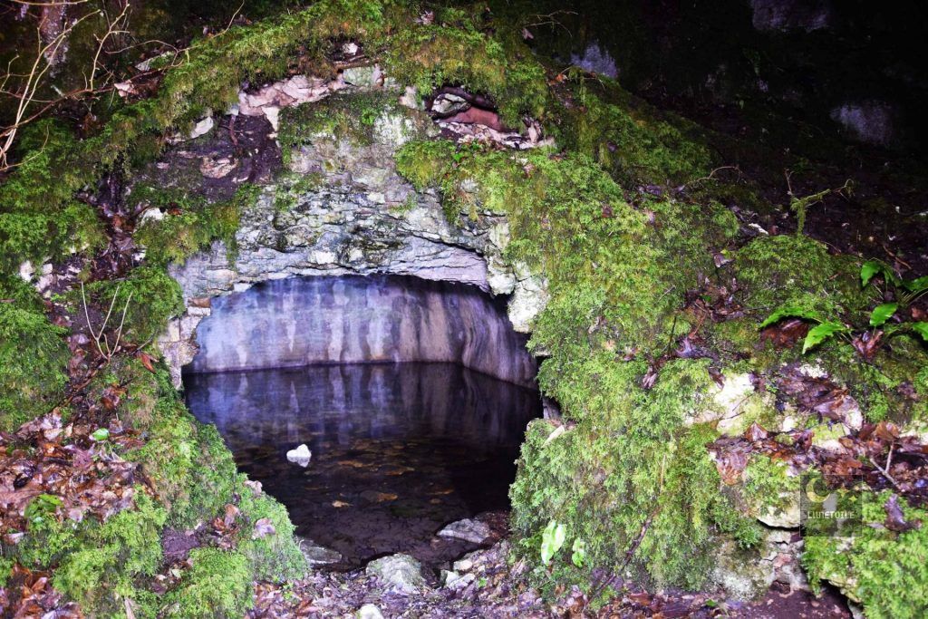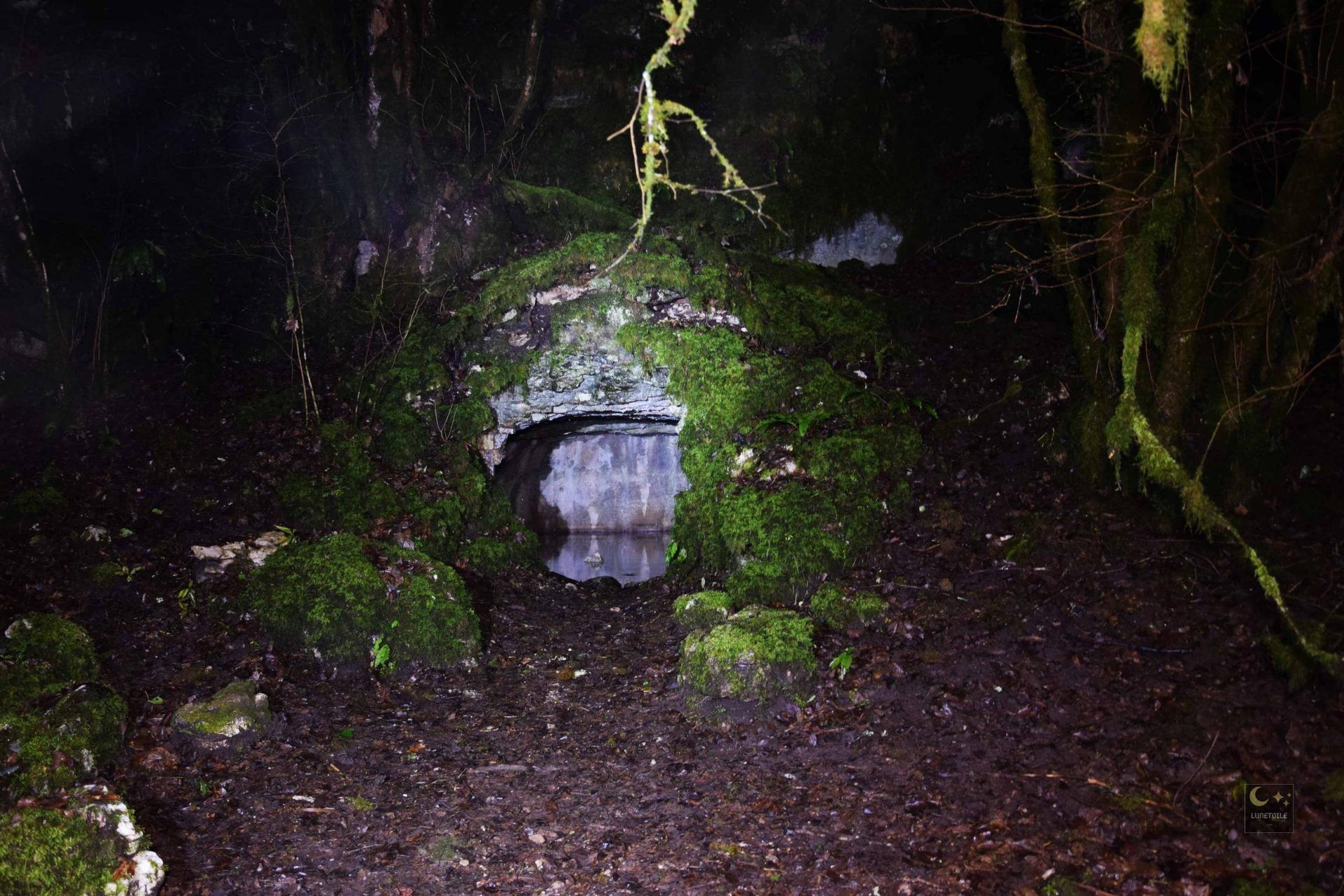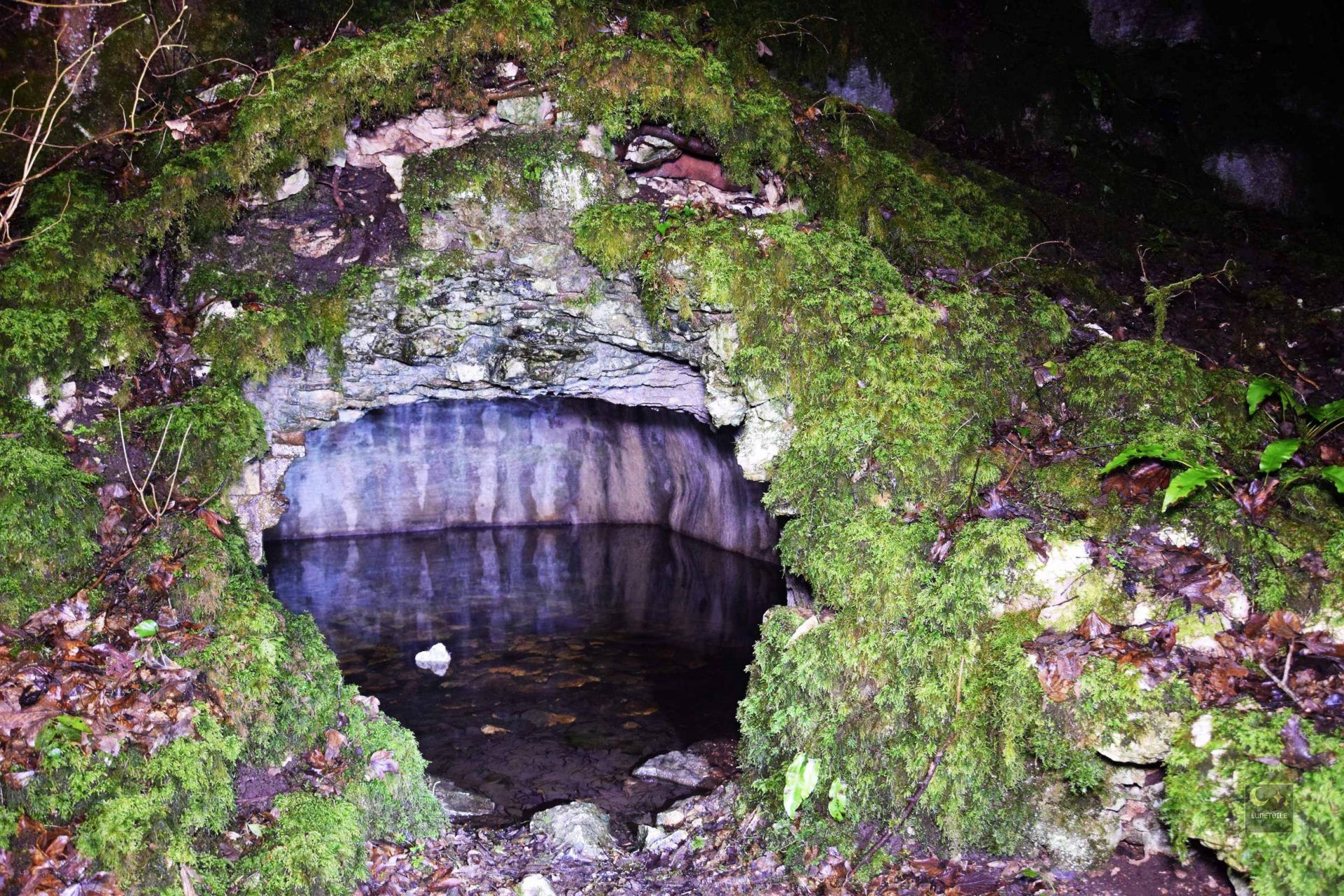 Bien loin du tumulte du fort et de ses falaises vertigineuses, au fond d’un vallon discret entre les parcelles de résineux, se cache l’un des lieux les plus singuliers de la forêt de Chailluz : la Fontaine des Acacias. C’est l’un des rares points d’eau permanents de tout le massif, creusé à flanc de doline : ces dépressions circulaires caractéristiques du relief karstique comtois dans un écrin de roches couvertes de mousse. L’eau y sourd doucement depuis des résurgences souterraines, froide en toute saison, dans un silence presque surnaturel.