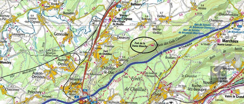 Le surnom de « Dame Blanche » ne vient pas du fort lui-même, mais d’un belvédère situé juste à côté, sur le territoire de la commune de Tallenay. C’est en ce lieu précis, perché sur la falaise dominant la vallée de l’Ognon, qu’une apparition spectrale aurait été observée par des paysans et des voyageurs, sans doute à partir du XVIIe ou XVIIIe siècle selon les sources locales. La légende est plus ancienne que le fort, qui ne fut bâti qu’à la fin du XIXe siècle ; le nom populaire s’y attacha naturellement, comme une empreinte du mystère sur la pierre.