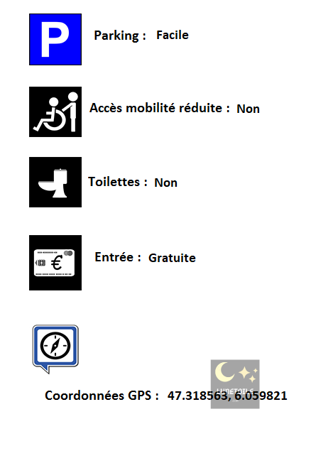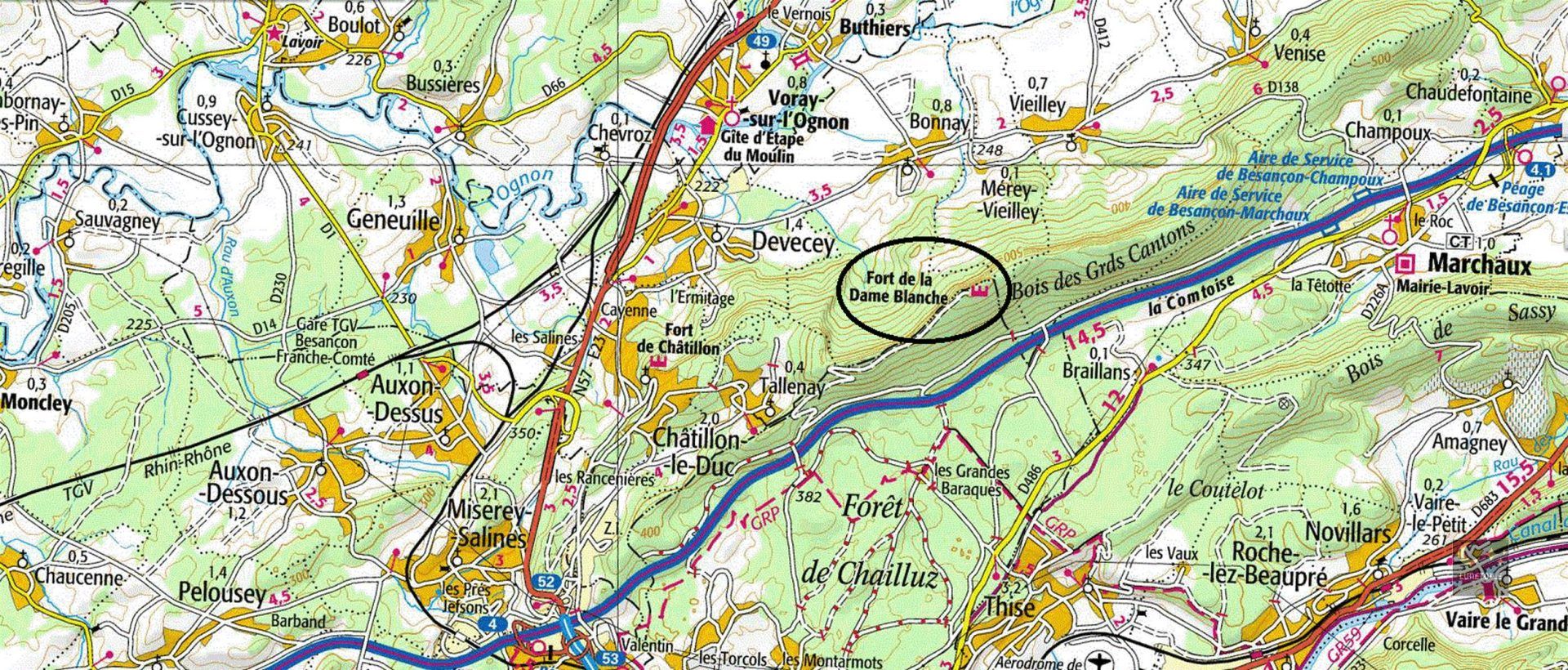 Depuis Besançon, prendre la D486 en direction de Thise, mais au croisement, au lieu de tourner à droite à Thise, prendre à gauche, continuer jusqu’au parking des Grandes Barraques. Vous êtes alors au centre de la foret de Chailluz, les panneaux indiquent les curiosités à voir, dont le fort de la Dame Blanche et les diverses fontaines.