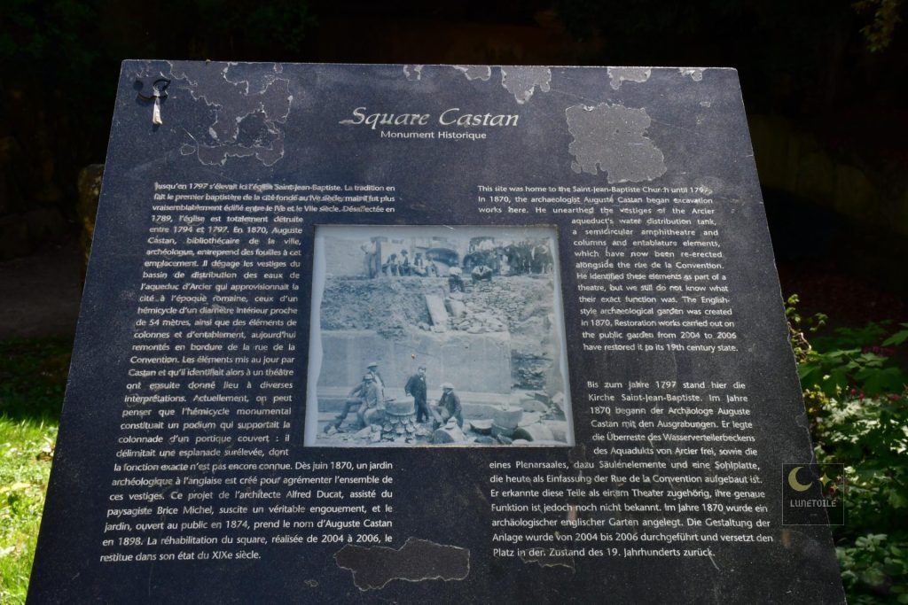 C’est à la veille de la guerre franco-prussienne de 1870 dont il devait tenir un journal personnel resté célèbre dans les archives bisontines qu’il entreprit les fouilles au pied de la cathédrale Saint-Jean. Dès juin 1870, la décision fut prise d’aménager un jardin pour mettre en valeur les découvertes. Castan fut nommé correspondant de l’Académie des inscriptions et belles-lettres en 1874 et membre associé de l’Académie royale de Belgique en 1881. Le square prit officiellement son nom en 1898, six ans après sa mort.