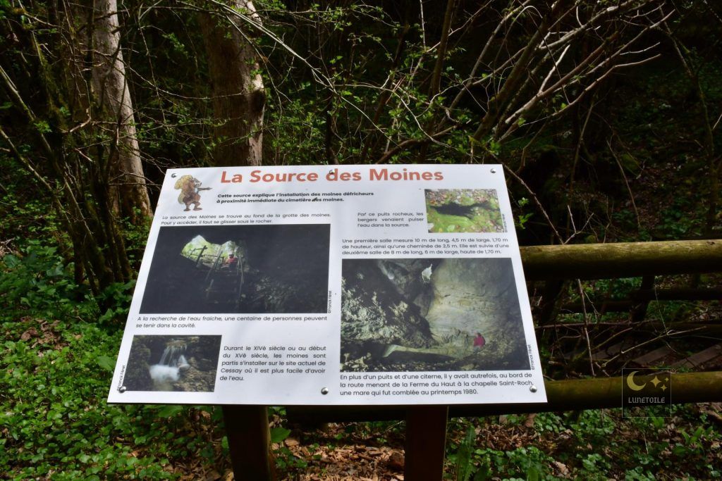 Le sentier conduit jusqu’à l’un des joyaux du site : la Source des Moines, accessible au fond d’une cavité rocheuse, dont la présence explique l’installation des moines défricheurs à proximité du cimetière qui porte leur nom. Un lieu chargé d’histoire, paisible et hors du temps.