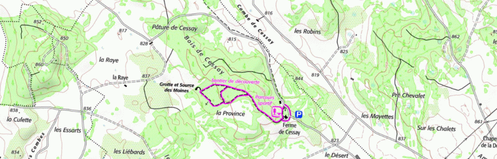 Depuis Frasne, prendre la direction de Pontarlier, à la sortie de Frasne, après le deuxième pont passant sur la voie ferrée, prendre la première à gauche, et continuer tout droit, passer la ferme, continue toujours sur cette petite route, après le poste électrique, continuer tout droit jusqu’à la Ferme de Cessay.